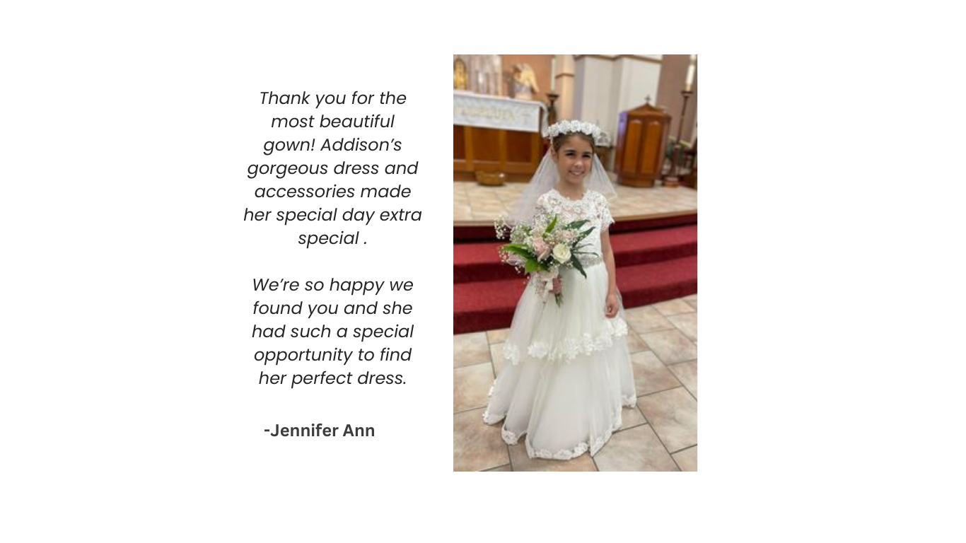 A child's First Holy Communion is a once-in-a-lifetime special occasion! The garments they wear on this special day should reflect on that. Gowns of Grace provides top-quality First Communion dresses for girls and suits for boys, making their special day memorable with beautiful, quality designs at a variety of prices. You will cherish this once-in-a-lifetime special occasion with your child. Choose a dress that she will cherish forever!